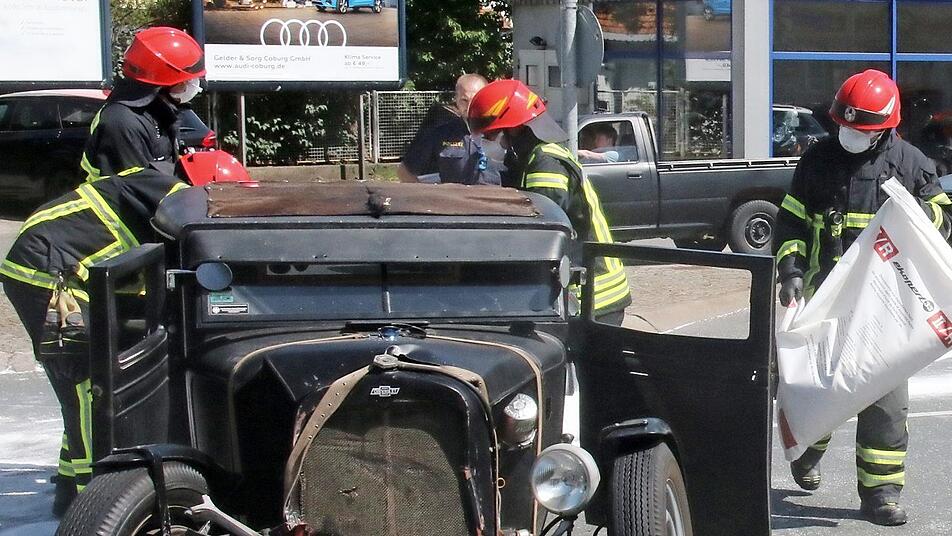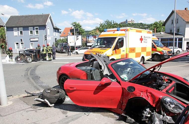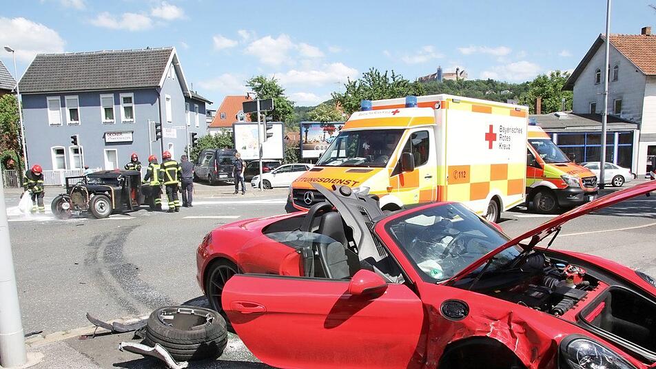 Ein Verkehrsunfall mit vier Verletzten hat sich am Freitagnachmittag um 15 Uhr am Thüringer Kreuz in Coburg ereignet. Wie die Polizeiinspektion Coburg berichtet, war ein 50-jähriger Coburger mit seinem Oldtimer der Marke Dodge Chrysler, Baujahr 1932 (TÜV neu vom 12. Juni 2020) - auf der Neustadter Straße unterwegs und wollte bei Grünlicht in den Kanonenweg einfahren. Zeitgleich fuhr ein 69-jähriger Mann mit seinem Porsche Boxster Cabrio von der Kasernenstraße in die Rodacher Straße. Der Porschefahrer nahm offenbar fälschlicherweise an, ebenfalls Grünlicht zu haben. Im Kreuzungsmittelpunkt kam es dann zu einem erheblichen Zusammenstoß beider Fahrzeuge.