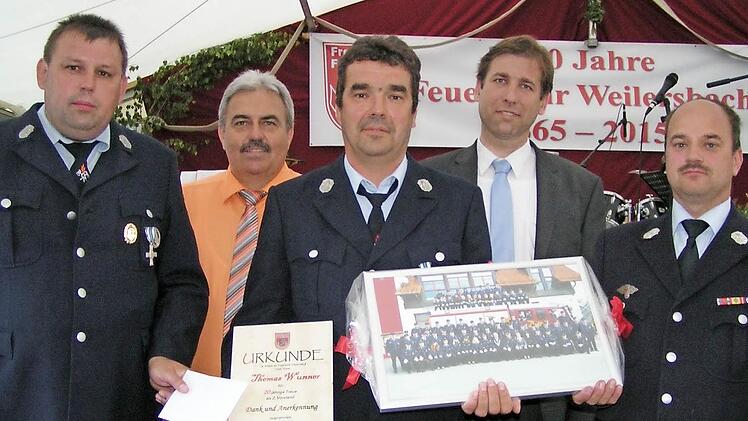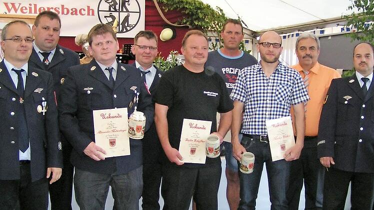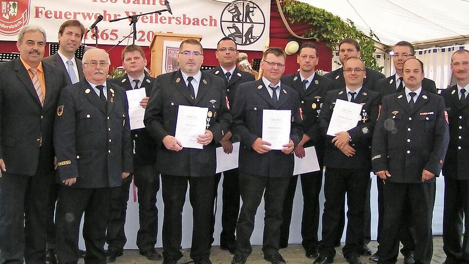 Ehe das von dem bereits verstorbenen Ehrenmitglied Walter Lahres geschriebene Feuerwehrlied gemeinsam gesungen wurde, regnete es geradezu von allen Seiten Lob, Anerkennung, Glück- und Segenswünsche. Am Rednerpult standen alle Sprecher der Patenvereine, die der befreundeten Feuerwehren und nicht zuletzt die fast sämtlicher Ortsvereine. Die Grüße der Volksbank Forchheim überbrachte Reinhardt Kraft, Leiter der Zweigstelle Weilersbach. Das große Jubiläumsfest im Ort nutzten die Weilersbacher Floriansjünger auch dafür, diejenigen auszuzeichnen, die sich seit vielen Jahren für die Wehr einsetzen.