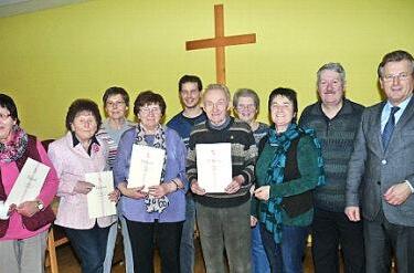 Bürgermeister Rainer Detsch dankte dem kleinen aber sehr rührigen Ortsverband für sein Engagement vor allem in der Bereicherung des Zusammenlebens in der Ortschaft. Vor allem den Jubilaren zollte Gemeindeoberhaupt Respekt und Anerkennung sowie die Wertschätzung für ihre jahrzehntelange Treue zu dem starken Sozialverband. Für ihre 50-jährige Treue zur Katholischen Arbeitnehmerbewegung wurden Gerlinde Biesenecker, Agathe Welscher und Walter Biesenecker mit der Ehrennadel in Gold und Urkunde geehrt.