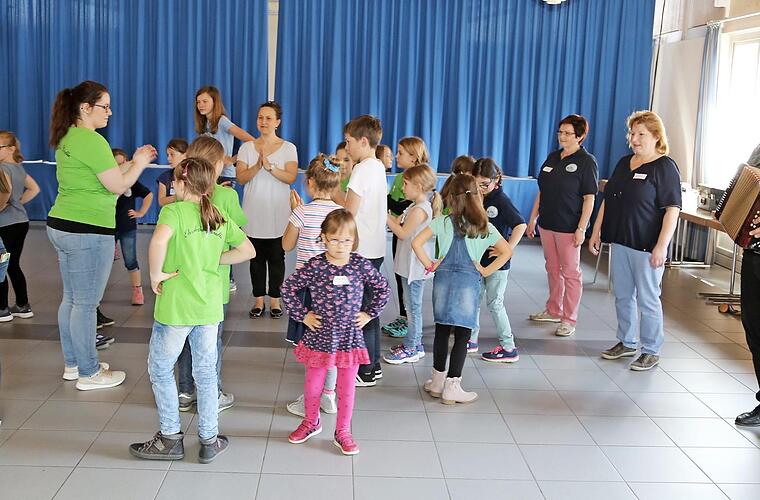 So übten die Kinder der Kirchehrenbacher Heimatfreunde, begleitet von Anna Maria Pauli, die Leutenbacher Gruppe des FSV, angeleitet von Ruperta Schramm und Agnes Häcklein, sowie die Gruppe des Heimat- und Trachtenvereins Kunreuth mit Birgit Brucker mit viel Ausdauer ihre Tänze ein, die sie gemeinsam auf dem Berg der Franken vortragen werden. Dazu zählen Volksweisen wie die Sternpolka, "Görgla" oder Topporzer (Kreuzpolka).