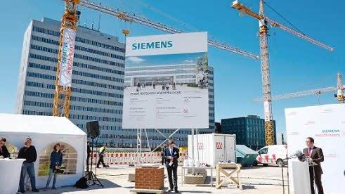 Neben der alten Firmenzentrale hat Siemens in Erlangen den Grundstein für sein neues Hauptquartier gesetzt. Das alte Firmenhochhaus soll 2018 abgerissen werden.