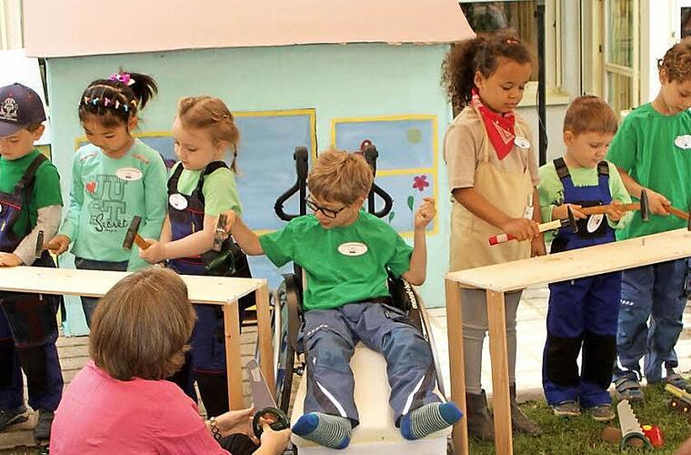 Wie dann der ganze Bau vor sich ging, zeigten die Buben und Mädchen dann in einer Aufführung rund um das Kartonhaus ihres Kindergartens. Die kleine Lia hatte anscheinend gelauscht, als sie meinte: "In der Trägersitzung ging es heiß her, des Rätsels Lösung ist wohl schwer. Gesucht wurde, wer den Umbau zahlt, auch wer uns einen Plan nun malt." Charlotte unterstrich die Forderung: "Ein neuer Schlafraum muss es sein, denn unsere Kleinen schlafen sonst nicht ein." "Wer 'nen Schlafraum bauen will, der braucht Handwerker", ertönte es dann im Lied und nacheinander erschienen die Handwerker und werkelten am Neubau.