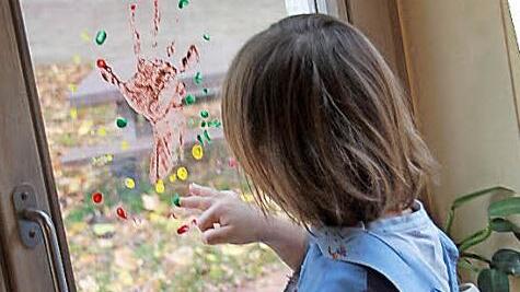 Durch die Wärme sind die Wachsmalstifte etwas geschmolzen und lassen das Licht der Kerze noch schöner durchscheinen", äußert Erzieherin Edith Frisch. Drachen haben die Kinder Anfang Oktober auch schon mit ihren Vätern gebastelt. "Es ist schon viel Herbstliches geschehen. Deswegen sind wir mit der Fensterdekoration jetzt auch etwas spät dran", sagt Frisch lachend. Jedes Kind darf seinen eigenen Baum an einer Fensterscheibe der Gruppe gestalten. Dafür wird eine Hand komplett und ein Teil des Unterarmes mit brauner Fingermalfarbe angemalt. Abgedruckt auf die Scheibe, ist der Unterarm der Baumstamm, die Hand die Baumkrone und die Finger sind die Äste. Damit der Baum nun auch herbstlich aussieht, werden die Blätter durch Fingertupfen in verschiedenen Farben angebracht. "Jedes Kind hat da seine ganz eigene Vorstellung: Manchmal hängen alle Blätter noch am Baum, manchmal liegen die meisten schon am Boden", so die Erzieherin. Bei dem Baum der kleinen Ida herrscht ein starker Herbststurm. Die meisten Blätter von ihr fliegen wild über das Fenster. Ben`s Baum hat die meisten Blätter schon verloren.