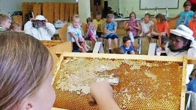 Wo kommt der Honig her? Diese Frage stand im Mittelpunkt einer Unterrichtsstunde der Grundschule am Mönchsturm. Erwartungsvoll blickten die Schüler der Klassen 1d und 1e auf die Hobbyimkerin Michaela Seufert. Diese hatte zahlreiches Anschauungsmaterial mitgebracht: Ein lebendiges Bienenvolk, Arbeitsmaterial des Imkers, Bienenwaben, eine Honigschleuder und vieles mehr. Interessiert beobachteten die Kinder das Bienenvolk und freuten sich darüber, die Königin entdeckt zu haben. Zwei Schüler schlüpften in die Schutzkleidung des Imkers. Nun ging es an die Arbeit. Waben wurden entdeckelt, Wabenbretter in die Schleuder gestellt und die Schleuder in Bewegung gesetzt. Begeistert kurbelten die Kinder und beobachteten das Herauslaufen des flüssigen "Goldes". Lohn der Arbeit war der Verzehr eines Honigbrotes.