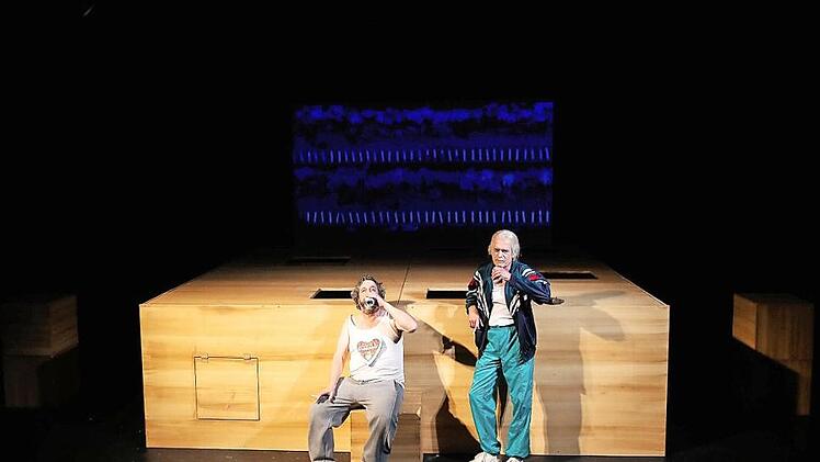 Der 1961 in Cottbus geborene Dramatiker begibt sich mit dieser Farce ins Milieu der absoluten Looser, wie man auch bei uns heute sagt, und übertreibt dabei, was der Dialekt nur hergibt. Konrad und Loddar sind biersaufend verlottert, als einsichtige Lebensphilosophen dabei geradezu herzig. Eine Weile ist es lustig, Stephan Mertl und Thomas Straus im Oberfränkisch der allerdrastischsten Ebene herumseiernd, zuzugucken. Die machen das richtig gut. Die echte Sau ist natürlich der Herr Professor Terre (Frederik Leberle), der im abstrakten Bühnenbild von Simone Steinhorst, bei dem du dir alles denken kannst oder nichts, auf die Bauklötze nach oben steigt. Dort doziert er, während die anderen in die Luken des großen Holzkastens abtauchen.