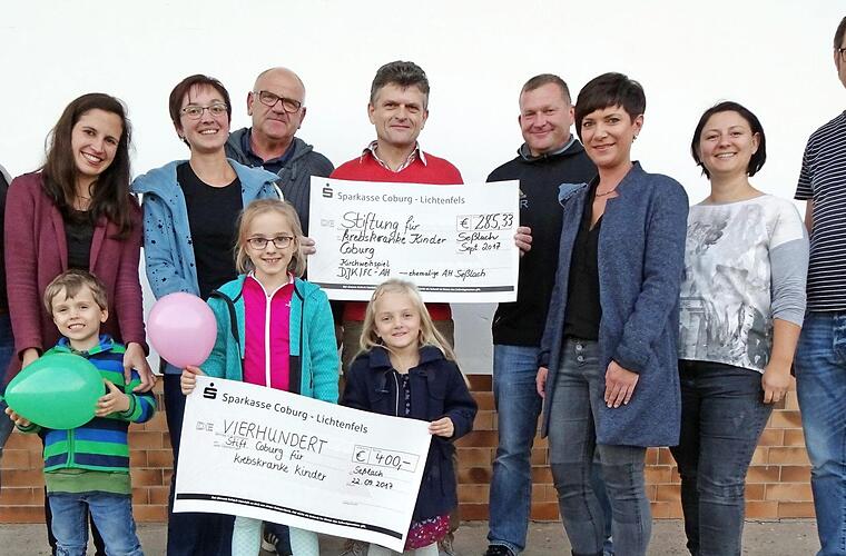 Gleich über zwei Spendenschecks konnte sich Hartmut Bohl von der Stiftung für krebskranke Kinder in Coburg freuen: 400 Euro kamen beim neuen Kinder-Secondhand-Basar im Sportheim des DJK/FC Seßlach Mitte September zusammen. "Der Basar wurde prima angenommen", freute sich Mit-Organisatorin Nina Reising. Beim Kirchweihspiel der AH Seßlach gegen die "Allstars"-Traditionsmannschaft von Seßlach blieben 285,33 Euro übrig, die von den Vorstandsmitgliedern Wolfgang Rößner und Marco Wittmann ebenfalls überreicht wurden. Stiftungsrat Bohl bedankte sich und versicherte, dass jede Spende auch ankomme. Derzeit würden 15 Familien mit einem akut erkrankten Kind betreut.