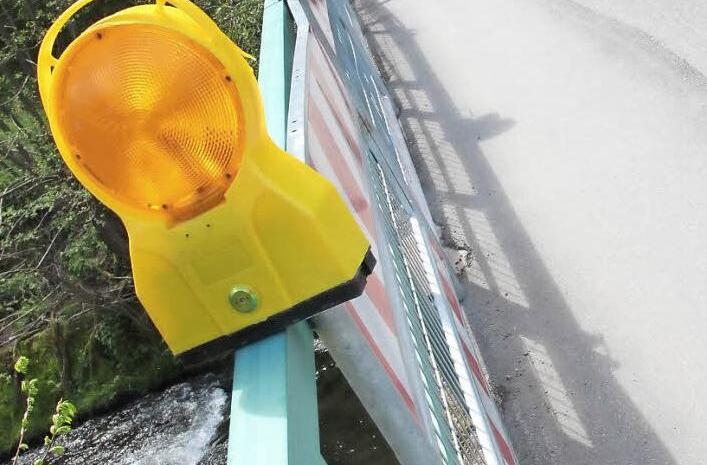 Gelbe Warnlampen, rot-weiße Metallabsperrungen - an der Gundelsdorfer Brücke über die Haßlach herrscht Baustellen-Flair. Doch hierbei handelt es sich nicht um eine Absperrung für Bauarbeiten, sondern um provisorische Sicherungsmaßnahmen. Am Fuß des eigentlichen Brückengeländers weist beispielsweise das bröckelnde Material auffällig darauf hin, dass dieses Bauwerk seine besten Tage weit hinter sich hat.