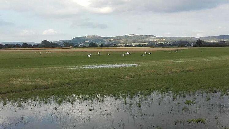 Leserfoto FT-Leser Winfried Schüpferling war mit seiner Lebensgefährtin auf einer Radtour und hat rund 50 Störche entdeckt. Aufgenommen im Wässergebiet Zweng, nahe Sigritzau, abends gegen 19 Uhr. Foto: Winfried Schüpferling