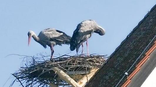 Angekommen! Das neue Frensdorfer Storchenpaar hat nicht lange gezögert und sein neues Zuhause sofort angenommen. Am Freitagnachmittag haben Thomas Stahl aus Burgebrach und die Biologin Sherin Saborowski als fachliche Begleitung das neue Storchenheim auf dem Dach des Museumsgasthofs aufgerichtet.