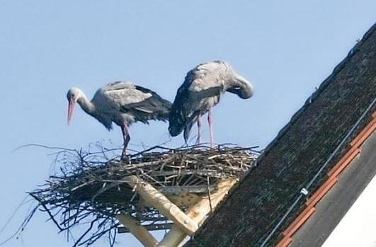 Wie Stahl berichtete, hat das Storchenpaar bereits die darauf folgende Nacht in seinem neuen Nest geschlafen. Bis dahin hatten Meister Adebar und seine Frau eifrig an einem Ausweichdomizil auf dem Schornstein des Rathauses gebaut. Ganz grau vom Ruß waren sie durch diese Arbeit schon geworden. Offensichtlich waren die beiden fest entschlossen, in Frensdorf anzusiedeln. Obwohl ihr erstes Nest auf dem Schornstein des Gasthauses im vergangenen Jahr entfernt werden musste.