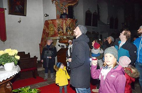 So bot sich eine besonders Bild in der ehrwürdigen Wallfahrtskirche Mariä Geburt Glosberg, in der sämtliche Lichter abgeschaltet waren. Annette Urban und Kirchenpflegerin Martina Stumpf hatten die Idee, zum Adventsauftakt einen schönen Abend in der Kirche zu verbringen und sich danach bei Glühwein und Würsten mit Musik und guter Unterhaltung im Vorhof der Wallfahrtskirche zu treffen. Über 40 Väter und Mütter, Omas und Opas waren mit Kindern und Enkeln in der Wallfahrtskirche erschienen, um dann Kirchenführerin Annette Urban zu Sakralfiguren und Schätzen dieses fast 300 Jahre alten Gotteshauses zu begleiten. Taschenlampen durften nur auf Anordnung eingeschaltet werden.