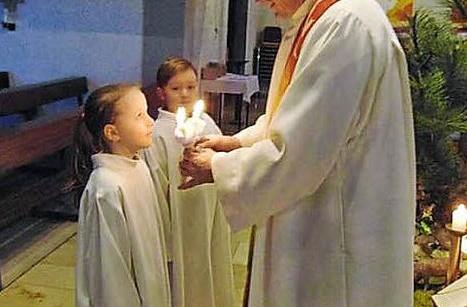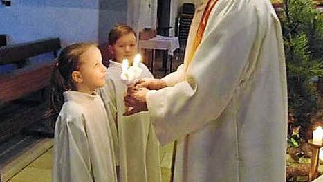 Bei ihrer Generalprobe zur Taufe erzählen sie das. Getauft wird vor der Weihnachtskrippe, die noch bis zum heutigen Lichtmesstag aufgestellt ist, dem "Aufleuchten von Weihnachten", wie Pfarrer Hornung es nennt. Denn Jesus sei 40 Tage nach seiner Geburt von Josef und Maria in den Tempel getragen worden. Jüdische Frauen galten nach der Geburt eines Sohnes als unrein und mussten ein Reinigungsopfer bringen. Maria brachte Turteltauben.