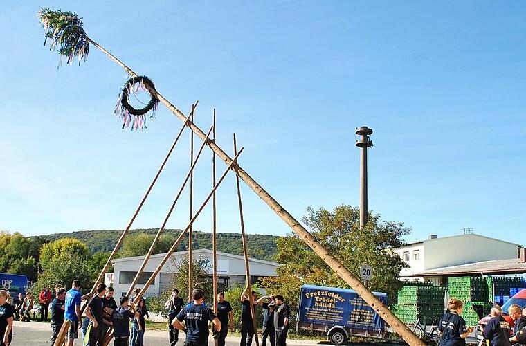 Bei schönstem Wetter wurde in Pretzfeld die Herbstkerwa gefeiert. Ausgerichtet wurde die Veranstaltung vom Musikverein Pretzfeld. Ganz traditionell stellten die Mitglieder der Feuerwehr den Kerwabaum auf. "Ich finde es schön, dass die jungen Paare wieder den Betzn austanzen. Das gab es eine Zeit lang nicht mehr", sagte Bürgermeisterin Rose Stark (SPD/Ökologen). Viele Gäste waren zu den verschiedenen Veranstaltungen um das Kerwa-Geschehen herum gekommen. Foto: Carmen Schwind