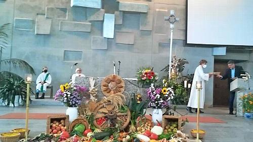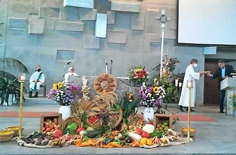 Zum Erntedankfest haben die Mitglieder des Obst- und Gartenbauvereins Garitz den Altar der St. Elisabeth-Kirche mit Obst, Gemüse, Blumen und Feldfrüchten dekoriert. Außerdem hat Vorsitzender Manuel O. Perez eine Spende aus dem Verkauf von Würzsträußen an Mariä Himmelfahrt an die Kirchengemeinde übergeben. red