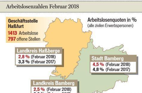 Die aktuell 1413 Erwerbslosen sind, so ein weiterer Vergleich, 195 Arbeitslose weniger als im Februar 2017. Die Arbeitslosenquote betrug jetzt im Februar 2,8 Prozent; vor einem Jahr belief sie sich laut Agenturangaben auf 3,3 Prozent.