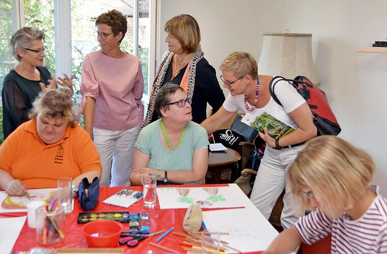 Gemeinsam mit ihrer Parteikollegin MdB Sabine Dittmar (SPD) besuchte Ulla Schmidt, ehemals Bundesgesundheitsministerin, die Lebenshilfe Bad Kissingen. Ulla Schmidt war von 2001 bis 2009 Gesundheitsministerin und von 2013 bis 2017 Vizepräsidentin des Deutschen Bundestages. Seit September 2012 ist die gebürtige Aachenerin, die auch heute noch als Bundestagmitglied aktiv ist, Bundesvorsitzende der Lebenshilfe Deutschland. So war es ihr erster offizieller Besuch bei der Offenen Behindertenarbeit (OBA) der Lebenshilfe in Bad Kissingen. Von der Nüdlinger Einrichtung kommend, besuchte sie die Einrichtung in der Gartenstraße 8, wo die OBA ein kleines Wohnheim mit acht Einzelzimmerwohnungen unterhält. "Ambulantes, unterstütztes Wohnen" wird hier von Behinderten praktiziert. Betreuer kommen stundenweise vorbei und helfen in schwierigen Lebenssituationen, andere halten im großen Gemeinschaftsraum diverse Kurse und Angebote der Offenen Behindertenarbeit ab. So auch beim Besuch der Lebenshilfe-Bundesvorsitzenden MdB Ulla Schmidt, als gerade ein von Eva Feichtinger durchgeführter Malkurs stattfand.
