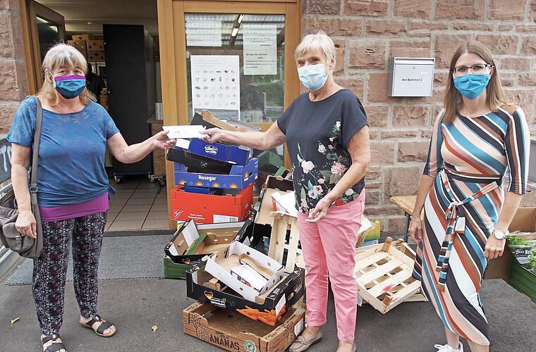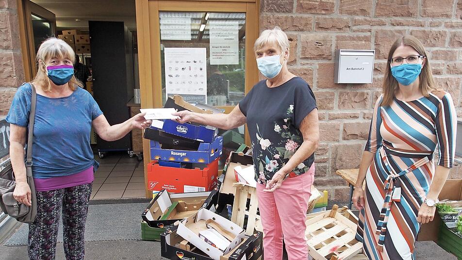 Reichlich Arbeit gab es am Donnerstag morgen für die Mitarbeiter der Hammelburger Tafel. Kisten mit Obst, Gemüse und Lebensmitteln wurden sortiert und verräumt. Schatzmeisterin Luise Smolik freute sich über die beiden Besucherinnen: Gerlinde Ebert und Ulrike Zehner waren gekommen, um erneut eine Spende aus dem Verkauf Mund und Nasen Masken vorbei zu bringen, die Ebert in Westheim selbst näht und Zehner in ihrem Geschäft Sammeln & Schenken in Hammelburg verkauft. Inzwischen hat Ebert seit Beginn der Corona-Pandemie 1300 Euro an die Tafel gespendet.