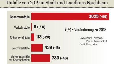 Insgesamt registrierte die Polizei in Forchheim und Ebermannstadt im Jahr 2019 3025 Unfälle in Stadt und Landkreis Forchheim (999 in der Stadt, 2026 im Landkreis). Dies bedeutet einen Anstieg im Vergleich zum Vorjahr, da waren es noch 2926 Unfälle.