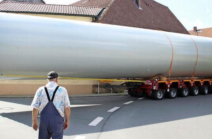 Das erste von mehr als zwei Dutzend überlangen Teilen für die Windräder bei Hain wurde angeliefert. Dabei ging es in Gärtenroth sehr eng zu. Ab heute sind zwei Fuhren pro Tag vorgesehen.