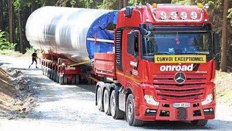 Mit dem Ablauf am Montag war Projektleiter Sebastian Sehl sehr zufrieden. Bei der Premiere hatte man die schmalere und leichtere der beiden Stahlröhren für das Windrad 2 geladen. Am Dienstag kommt das wesentlich schwerere und dickere Rohr dran, das direkt auf den bisherigen und 78 Meter hohen Betonturm montiert wird. Am Dienstag weiß Sebastian Kehl auch, dass der Selbstfahrer - trotz seiner acht angetriebenen Achsen und 64 Reifen - bei den "7 Fuhren" eine Vorspann braucht.
