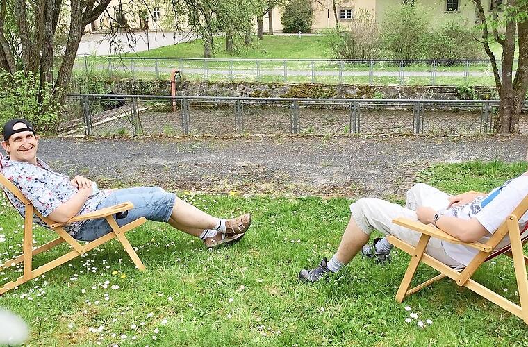 Ein erstes Testsitzen auf den neuen Liegestühlen war auch schon möglich. Die in rot-weiß gehaltenen Liegen sollen sommerliches Flair vermitteln. Denny Uhlemann, Mitglied der Bewohnervertretung Wohnen am Standort Maria Bildhausen, und ein Mitbewohner haben beim Probesitzen mitgemacht und das Mobiliar für gut befunden. "Ich freue mich schon auf unsere Urlaubsinsel - es ist fast wie in Griechenland", sagt Denny Uhlemann.