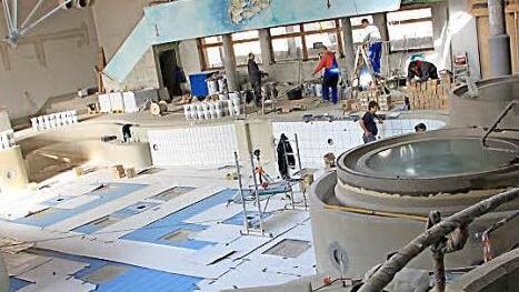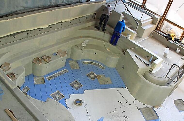 Bad Staffelstein — Die Badehalle II ist eine Baustelle. Dutzende Arbeiter sind am Werkeln. Sie hämmern, schleifen, sägen, kleben Fliesen und verlegen elektrische Leitungen. In wenigen Wochen kann hier wieder gebadet werden - in einem Ambiente, das zeitgemäß ist und das etwas fürs Auge bietet. Der Bereich der bisherigen Grotte steht im Zentrum der Neugestaltung. Hier lassen sich die Konturen der neuen Lichtbetongrotte bereits erkennen. Im Boden werden Massagedüsen eingebaut, der Beton wird farbig leuchten.