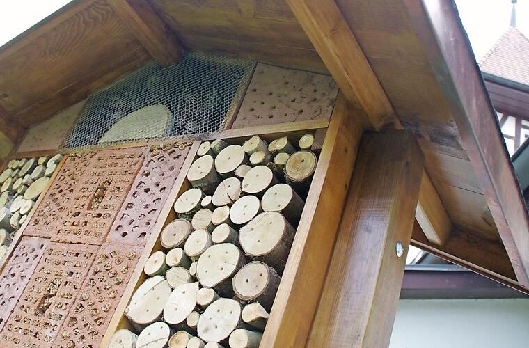 Die Wildbienen verkriechen sich gerne in Hohlräumen unterschiedlichster Art, um zu überwintern. Gerne nehmen sie auch künstlich geschaffene Nist- und Überwinterungshilfen an, so wie das Insektenhotel im Garten des Kindergartens. So wurde auch das Insektenhotel aus Hartholzblöcken, Holzbeton und Klinkersteinen mit unterschiedlichen Bohrungen mit Niströhren versehen. Durch intensive menschliche Eingriffe in die Naturlandschaft - unter anderem durch umfangreichen Pestizideinsatz im Acker- und Gartenbau sowie durch die auch in Privatgärten vorhandene Tendenz zur "aufgeräumten" Landschaft - seien nur noch wenige natürliche Insektenlebensräume vorhanden. Nicht nur in der freien Natur, auch in Gärten helfen viele Nützlinge, wie zum Beispiel Hummeln, Wildbienen, Schlupf-, Falten-, Grab- und Wegwespen, Florfliegen oder Ohrwürmer durch Bestäubung und als kostenlose biologische "Schädlingsbekämpfer", das ökologische Gleichgewicht zu bewahren.