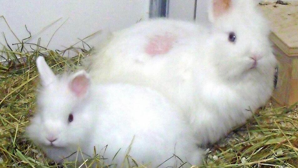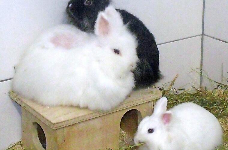 Vier Langohren ("Leila", weiblich, Angorakaninchen, geb. 2014; "Semmel", weiblich, Angorakaninchen, geb. ca. 1/16; "Brösel", männlich, kastriert, Angorakani...