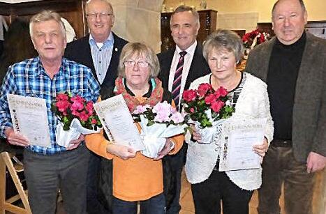 Elsbeth Bauer, Gerlinde Blinninger, Reinhard Schmidtkunz und Richard Steinlein wurden für ihre 40-jährige engagierte Mitgliedschaft mit der Ehrennadel in Gold des Bayerischen Landesverbandes für Gartenbau und Landespflege ausgezeichnet. Die Ehrung stand am Dreikönigstag im Vordergrund der Jahreshauptversammlung des Obst- und Gartenbauvereines Kupferberg im Gasthof Schif-fauer. Die Auszeichnungen und Ehrenurkunden überreichten Kupferbergs Bürgermeister Alfred Kolenda, der Gartenbau-Kreisvorsitzende Günter Reif und Ortsvorsitzende Gerhard Schicker. Seitens der Kupferberger Gartenfreunde dankte Schicker den Geehrten zudem mit einem Blumengruß.