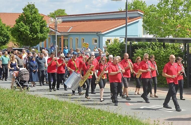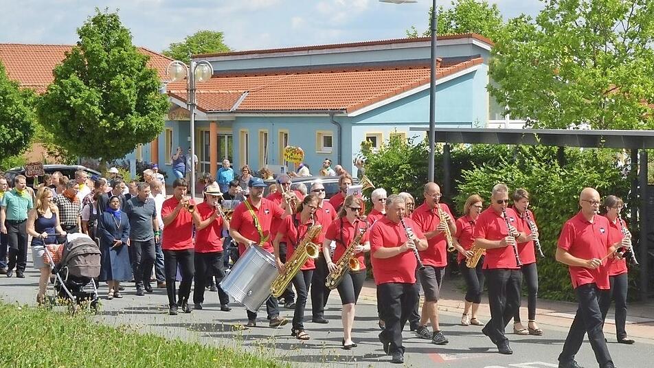 Angeführt von der Siemens-Healthcare-Concert-Band aus Erlangen zog ein Großteil der Bewohner der Barmherzigen Brüder Gremsdorf zusammen mit den Gästen in einem langen Zug quer durch das Einrichtungsgelände, um sich anschließend zum gemeinsamen Mittagessen im Festzelt zu treffen.