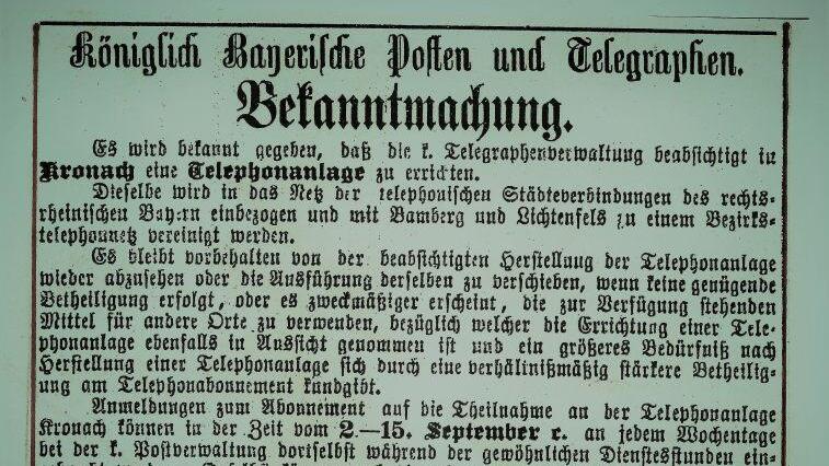 Allerdings brachte man anfangs im Frankenwald dieser neuzeitlichen Errungenschaft wenig Verständnis entgegen. Am 1. März 1883 wurde in München die erste Telefonanlage mit 118 Anschlüssen in Betrieb genommen. Es folgten Nürnberg-Fürth (1885), Bamberg (1886), Würzburg (1887) und Hof (1890).