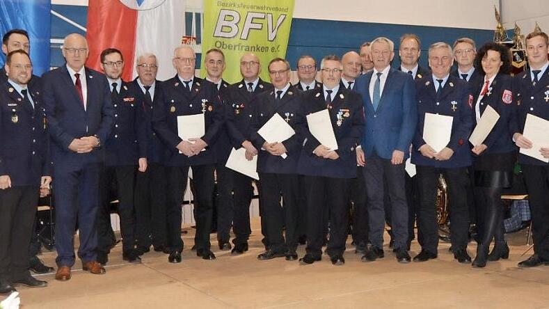 40 Jahre aktiven Dienst leisteten: Dieter Wende, Gerhard Reichelt, Stefan Kraus. Werner Romig, Hans Körber, Roland Christel und Helmut Bickel (alle Feuerwehr Hirschaid), Otmar Kraus und Michael Arneth (beide Feuerwehr Seigendorf) sowie Manfred Wittmann (Feuerwehr Köttmannsdorf).