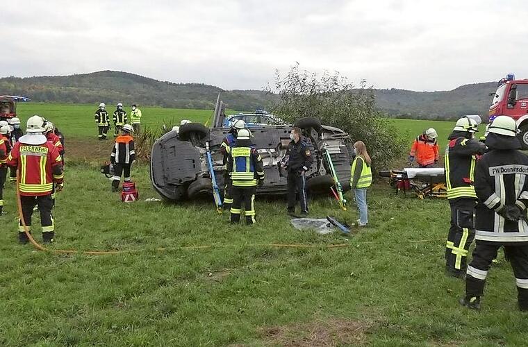 Während der Erstversorgung durch die Feuerwehr Oberschwappach brachten die Feuerwehren Knetzgau und Donnersdorf zwei Rettungssätze in Stellung und sicherten den VW gegen Umkippen. Nach der ersten Sichtung durch die Notärztin wurde entschieden, die Rettung des Mannes durch die Frontscheibe vorzunehmen. Mit einer Elektro-Säbelsäge wurde das Glas entfernt, wie der Knetzgauer Kommandant und Einsatzleiter Thomas Finger berichtete. Der Fahrer, der alleine im Auto unterwegs war, wurde schwer verletzt durch den Rettungsdienst in ein Krankenhaus eingeliefert. Lebensgefahr bestand jedoch nicht.