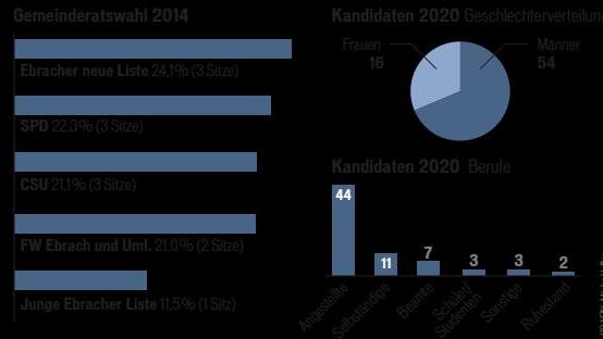 Zwölf Plätze gilt es im Marktgemeinderat der 1800 Einwohner zählenden Kommune zu besetzen. Dafür können die Listen maximal 24 Männer und Frauen aufstellen. Diese Höchstzahl reizt allerdings nur die Ebracher Neue Liste aus. Ob dies ein Vorteil gegenüber den Mitbewerbern ist, die deutlich weniger Kandidaten aufbieten, wird sich zeigen. mm
