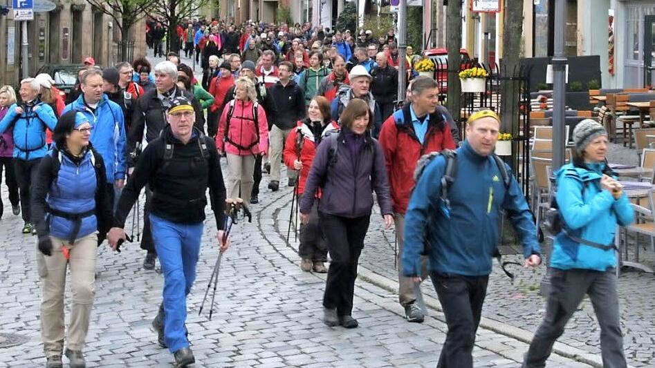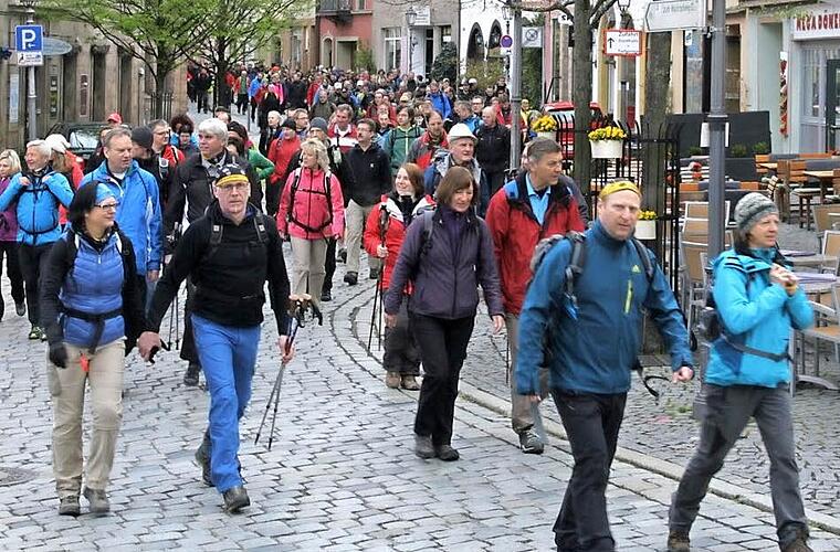 Punkt sieben Uhr hatte Oberbürgermeister Henry Schramm die Wanderer auf die Strecke geschickt, assistiert von Landrat Klaus Peter Söllner und Chef-Organisator Markus Franz. Einige Teilnehmer marschierten gleich sehr zügig den Burgberg hinauf. Sie waren nach einer knappen Dreiviertelstunde in Tennach beim Rangabauern.