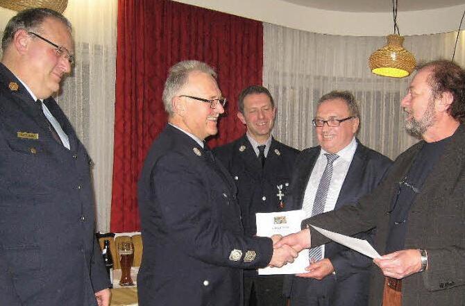 Mit dem Feuerwehr- Ehrenzeichen in Gold für 40-jährige aktive Dienstzeit zeichnete stellvertretender Landrat Dieter Schaar Hans Tischhöfer aus . Dieser meinte: "Es war eine schöne Zeit in der Wehr. Es gibt nichts Schöneres, als wenn man helfen kann."