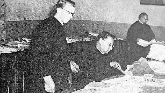 Hygiene war im Kampf gegen die Krankheit - wie auch bei Corona - ein wichtiges Pfrund. Das zeigen alte Fotos, die beispielsweise die Patres Manfred, Thomas und Aquilin beim Sortieren von desinfizierter Wäsche zeigen.