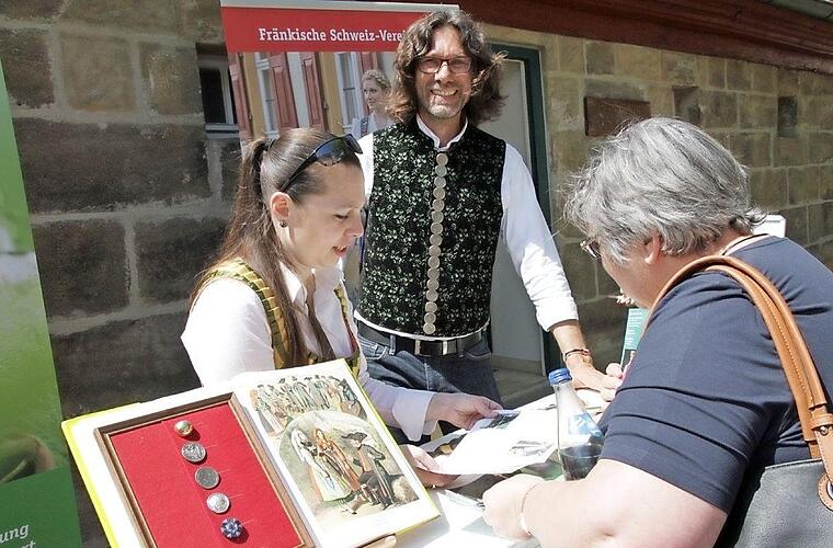 Der Vorsitzende des Arbeitskreises "Männertracht", Walter Appelt, und Schneidermeisterin Christiane Roit zeigten den Besuchern, wie eine "moderne Tracht" aussehen kann. "Die Tracht hat sich schon immer weiterentwickelt. Man muss heute nicht unbedingt sieben Unterröcke tragen", so der Fachmann. Auf Basis der historischen Trachten hat es sich der Fränkische-Schweiz-Verein zur Aufgabe gemacht, eine tragbare und moderne Tracht für Frauen und Männer zu präsentieren.