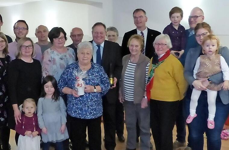 Im großen Kreise der Familie feierte Gunda Kolb im Gemeindesaal ihren 80. Geburtstag. Die Jubilarin ist in Untersteinach geboren, aufgewachsen und zur Schule gegangen. Gunda Kolb hat zwei Töchter, ihre große Freude sind die fünf Enkel und fünf Urenkel. Die Segenswünsche der Kirche überbrachte Pfarrer Wolfgang Oertel. Für die Gemeinde Untersteinach gratulierte Bürgermeister Volker Schmiechen. Von der VR-Bank Oberfranken war Reinhard Müller gekommen. Die besten Wünsche des Seniorenkreises der Kirchengemeinde sprach Otmar Müller aus. Nicht fehlen durften die Freundinnen, Nachbarn und Bekannten. Im Bild Gunda Kolb (vorne, mit Geschenk) mit der Gratulantenschar. Foto: Klaus-Peter Wulf