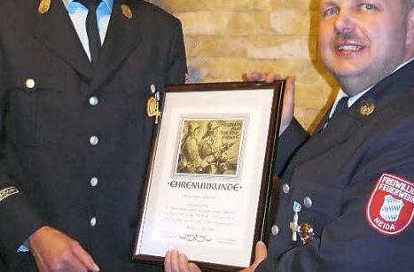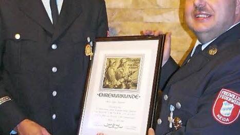 Kommandant Dietmar Ehrlicher ernannte Marcel Renner zum Feuerwehrmann und übergab das Dienstabzeichen. Er wechselte von der Jugend zur aktiven Wehr. Darüber hinaus wurde Edgar Schelhorn nach 47 aktiven Dienstjahren zum Ehrenmitglied ernannt. Als Anerkennung für seine Verdienste erhielt er eine Ehrenurkunde.