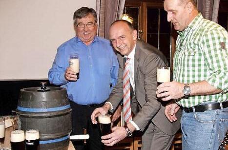 Traditionell wird bei den Jahresversammlung ein gespendetes Fass Bier angestochen. Die Vertreter der Dorfgemeinschaft und Siebener sowie Feuerwehrmitglieder und Ortsburschen sitzen zusammen.