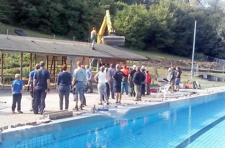 Die Vorstände staunten nicht schlecht darüber, dass über 50 Personen zur ehrenamtlichen Mithilfe beim Abriss des Kassen-, Kiosk-, Umkleide-, Lager- und Bademeistergebäudes zum Arbeitseinsatz angerückt waren.