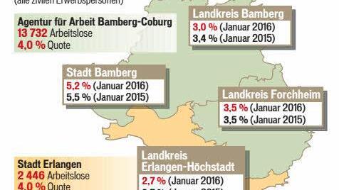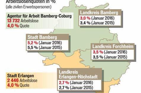 Nach moderaten Anstiegen im November und Dezember ist mit einer Zunahme der Arbeitslosigkeit um 2420 Personen oder 21,4 Prozent im Januar die typische jahreszeitlich bedingte Steigerung zu verzeichnen. Wie die Agentur für Arbeit meldet, waren im Agenturbezirk Bamberg-Coburg zum Stichtag 13 732 Menschen ohne Job. Damit ergibt sich eine Arbeitslosenquote von 4,0 Prozent, im Dezember lag diese bei 3,3 Prozent.