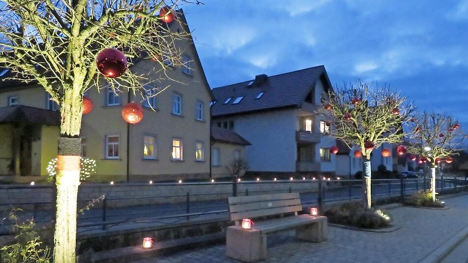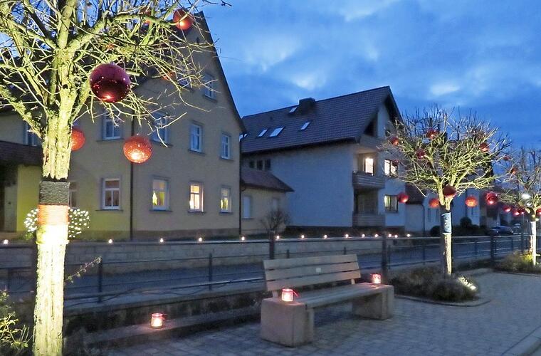 "Die kommen durch die Anstrahlung besonders gut zur Geltung und sollen Gemeinsamkeit und Zusammenhalt dokumentieren", freut sich die Ortsbeauftragte und sagt Dankeschön an die Spender von Kugeln, Misteln und Strickwaren sowie an die Installateure der Strahler.