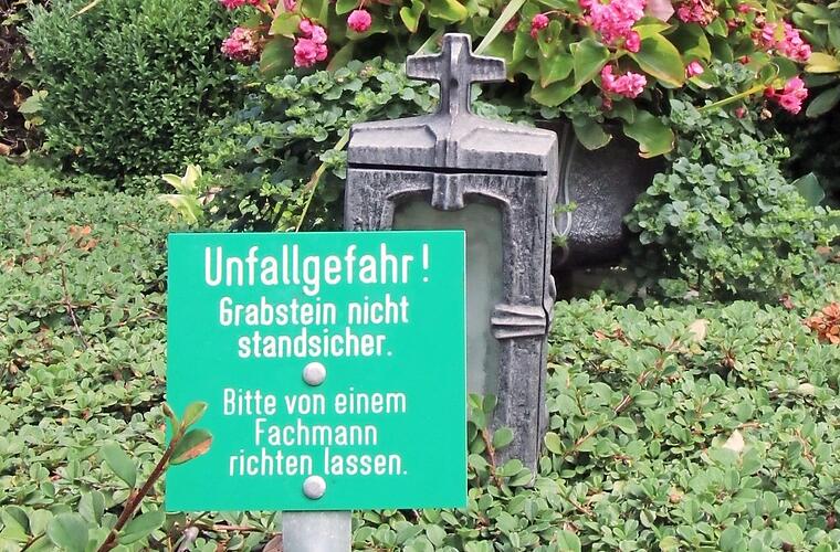 Die deutsche Bürokratie wirkt auch über den Tod hinaus. "Unfallgefahr! Grabstein nicht standsicher. Bitte von einem Fachmann richten lassen", lesen überraschte Hinterbliebene auf Hinweisschildern auf dem Bamberger Friedhof. Hintergrund ist die Unfallverhütungsvorschrift VSG 4.7 der Sozialversicherung für Landwirtschaft, Forsten und Gartenbau: Sie verpflichtet die Verwaltung, die Stabilität der Grabmale jedes Jahr aufs neue zu überprüfen - 16 000 an der Zahl.