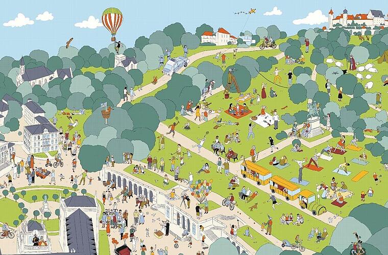 Es ist der besondere Blickwinkel, der den Charme von Wimmelbüchern ausmacht. Die Devise lautet: suchen, finden und entdecken. Dana Gerber hat sich die künstlerische Freiheit genommen und Coburg aus ihrer Perspektive gezeichnet. Herausgekommen sind sechs kunterbunte Stadtansichten - vom Marktplatz bis hin zum Aquaria. Allein auf der Doppelseite vom Hofgarten wimmeln 251 Menschen und 44 Tiere über die Wiesen und den Schlossplatz.