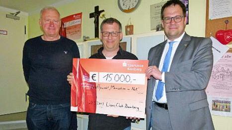 Marion Krüger-Hundrup Der symbolische Scheck über 15 000 Euro wurde dort überreicht, wo sich die Gäste des Treffpunkts "Menschen in Not" hauptsächlich versammeln: in der großen Wärmestube, in der auch die kostenlosen Mittagessen eingenommen werden. Freundlicher Beifall brandete auf, als Michael Eigner, Präsident des Lions-Club Bamberg, und Vize-Präsident Jürgen Bruhn das überdimensionale Dokument an Einrichtungsleiter Peter Klein weiterreichten. Und es stand eine Frau von der hinteren Stuhlreihe auf, ging zu den Lions-Männern nach vorn und sagte "im Namen aller Danke für die Spende und auch für die jährlichen Weihnachtstüten!"