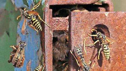 Ausgerechnet das defekte Schloss eines Hoftores in der Zent haben sich diese Wespen als Bleibe für den Sommer gesucht. Durch einen Schlitz gelangen sie ins Innere, auch das Schlüsselloch benutzen sie ...
