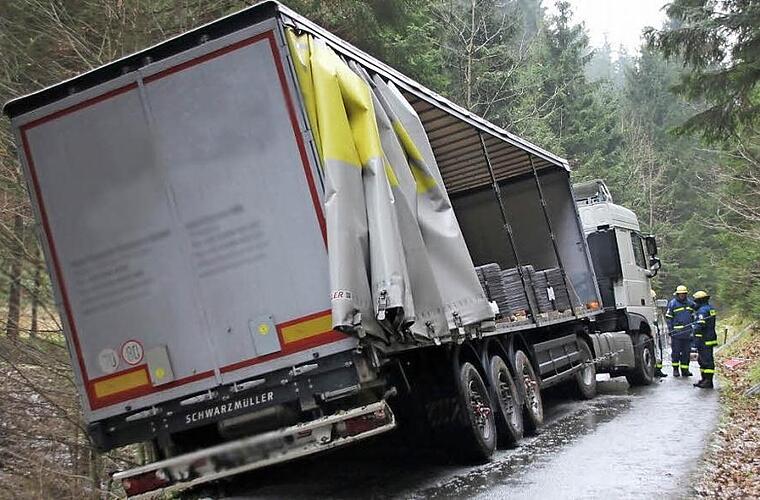 Gegen Umstürzen gesichert In der Dunkelheit wollte der Fahrer die lange Strecke nicht rückwärts fahren und entschied zusammen mit seinem Beifahrer, die Nacht im Laster zu verbringen. Am Dienstag, als es hell wurde, fuhr er rückwärts. Bereits nach einer kurzen Strecke touchierte er mit dem rechten hinteren Eck den Hang, wodurch der Unterfahrschutz verbogen wurde. Gegen 9 Uhr versank er mit der linken Seite im aufgeweichten Bankett und drohte umzustürzen.