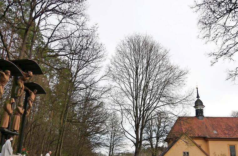 Mit einem Gottesdienst am Freialtar der Talkirche hat die Pfarrgemeinde Münnerstadt am letzten Aprilwochenende die Saison der Gottesdienste an der kleinen Wallfahrtskirche eröffnet. Wegen Corona werden heuer alle Messen und Andachten nicht in der Talkirche, sondern im Freien zelebriert. Pfarrer P. Markus Reis freute sich im Gottesdienst, dass es trotz Lockdowns möglich ist, die Tradition aufrecht zu erhalten, ab Ende April Gottesdienste in der Wallfahrtskirche anzubieten. Er bezeichnete dies als Geschenk. Da die Anzahl der Plätze im Gotteshaus nicht ausreichen, weiche man auf die Freianlage aus. Die ist dafür vorbereitet, denn vor genau 80 Jahren wurde dort eine Kreuzigungsgruppe mit Freialtar errichtet. Hier ist genügend Platz, um Gottesdienste mit viel Abstand anzubieten. P. Markus dankte der Talkirch-Messnerin Anna Hümpfner für ihre Vorbereitungen.